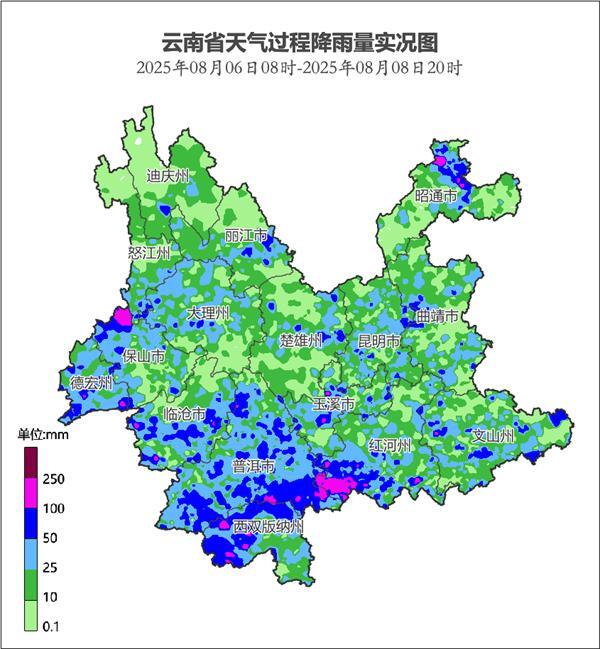 8月8日晚,中東部、南部、西部邊緣等地出現(xiàn)強(qiáng)降雨過(guò)程已結(jié)束,過(guò)程平均雨量26.1毫米,最大小時(shí)雨量94.6毫米,出現(xiàn)在昭通市鹽津縣廟壩鎮(zhèn)黃草站。